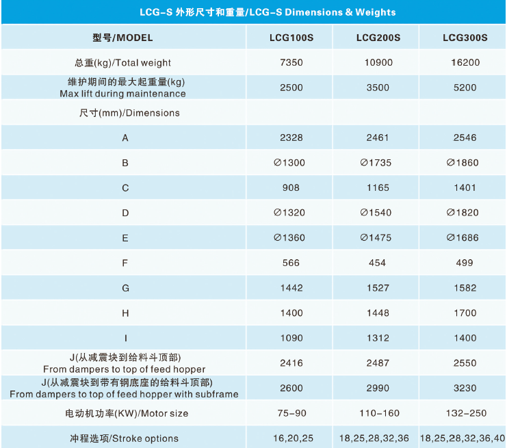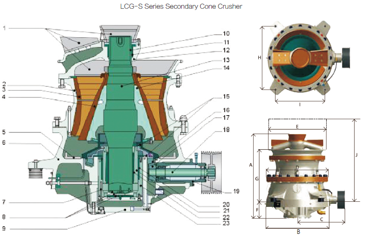 Luckcome has developed the LCG series cone crushers to fulfill all crushing needs. Incorporating the latest crusher know-how, the LCG series combines the highest crushing efficiency and end product quality with the lowest per ton production costs. If your aggregate or mining business demands big capacities, first-class cubicity or full mobility, you will find a Luckcome LCG crusher optimized for your needs. The LCG series cone crushers also provide you with unlimited possibilities in smooth process adaptation and full crushing process automation. Three typical crusher sizes are available for LCG-S series secondary cone crushers, altogether a selection of six different cavity profiles. Another five crusher sizes are available for LCG series cone crushers