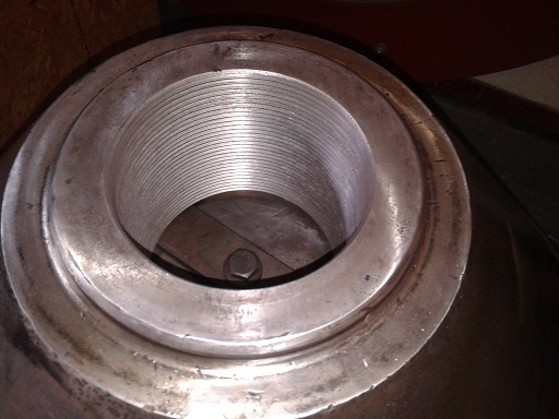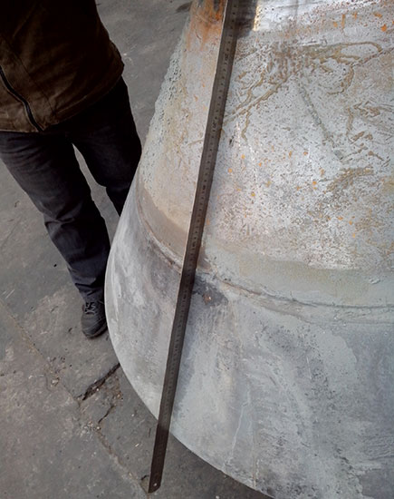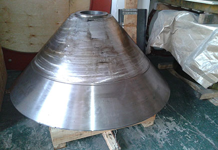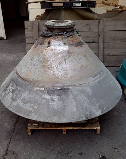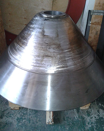 2014-06-10 客戶HP500 破碎機動錐體在更換襯板時發(fā)現(xiàn)鎖緊螺栓不能拆卸,運到我公司維修。由我司技術(shù)人員判定為動錐體內(nèi)螺紋損壞,同時檢查動錐體外錐面,發(fā)現(xiàn)磨損嚴(yán)重。