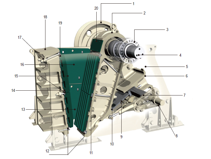 LCC 系列顎式破碎機(jī)都裝備有雙楔塊排礦口調(diào)整系統(tǒng),其堅(jiān)固且調(diào)整快捷的優(yōu)勢(shì)在行業(yè)內(nèi)已經(jīng)得到證明,該系統(tǒng)在對(duì)于由于供電中斷導(dǎo)致系統(tǒng)帶負(fù)載停機(jī)而需要清腔時(shí)尤其有效;橡膠減震裝置和限位塊可以吸收震動(dòng)峰值載荷,并允許破碎機(jī)垂直和縱向位移,從而有效地降低破碎機(jī)對(duì)基礎(chǔ)的沖擊;電機(jī)機(jī)座與破碎機(jī)機(jī)架一體安裝,減少了破碎機(jī)安裝空間和 V 形帶的長(zhǎng)度。